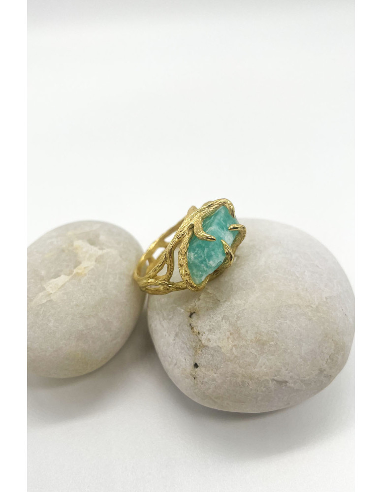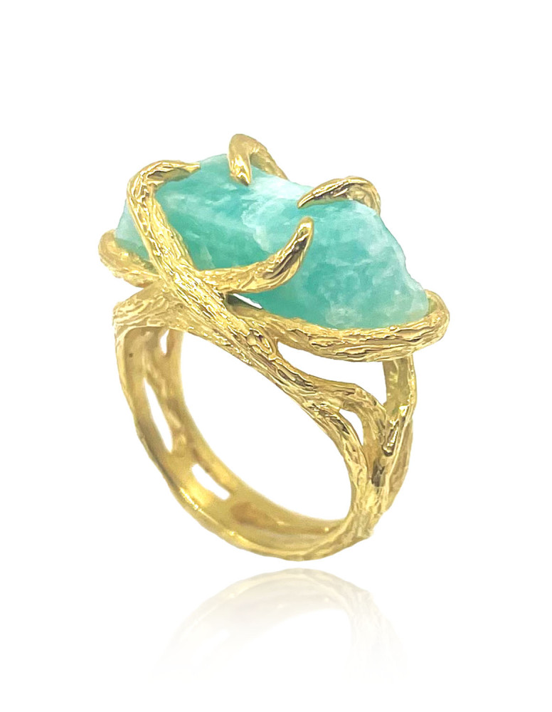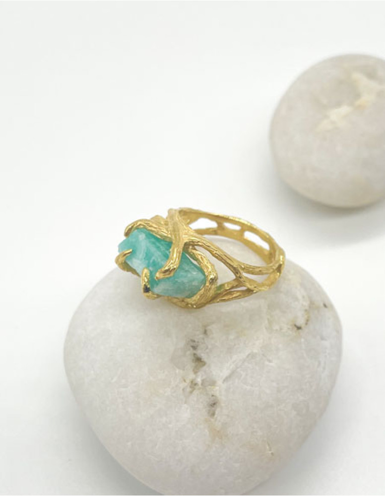 Sothio Jewelry’nin Silent Forest Koleksiyonu'na ait Mossira Yüzük, doğanın enerjisini zarif bir tasarımla buluşturuyor. Bu el yapımı yüzük, büyüleyici yeşil tonları ile amazonit taşını, 925 ayar gümüş üzerine 18 ayar altın kaplama ile birleştirerek, tek ve eşsiz bir parça olarak tasarlanmıştır. Amazonit taşının huzur ve denge sağlayan doğasından ilham alan Mossira, ormanın derinliklerindeki dinginliği elinizde hissettirir. Hem günlük hayatta hem de özel günlerde stilinize mistik bir dokunuş katan bu yüzük, koleksiyonunuza ayrıcalıklı bir değer katacak.